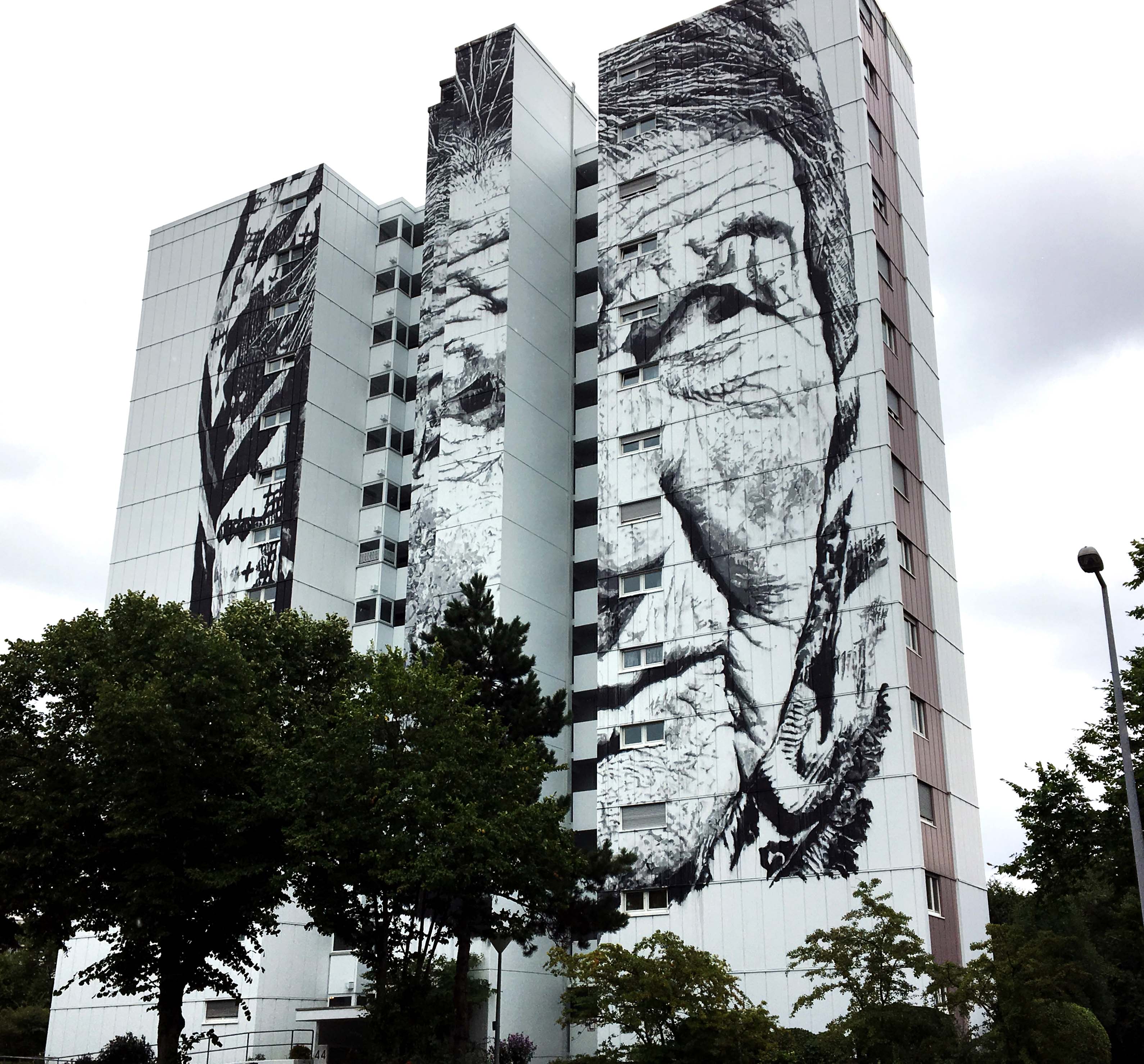 Hendrik Beikirch ist mir in Köln, am Westbahnhof, das erste Mal begegnet und da gab es 2015 in der Galerie Ruttowski;68 diese wunderbare Ausstellung von ihm. Einmal hatte ich die Chance, Hendrik direkt beim Malen zuzusehen, und als wir in Köln auf dem Gelände von Jack in the Box ankamen, war er leider schon fertig. Shit happens, dachte ich mir. Aber ich konnte beobachten, wie er, vom gegenüberliegenden Dach, sein frisches Bild fotografierte und zusah wie die Menschen darauf reagierten (und fotografieren konnte ich ihn dabei natürlich auch). Vor einigen Jahren hat er das höchste Mural Asiens in Korea gemalt und in Indien hatten wir 2014 das Glück seinen „Gandhi“ in Delhi zu sehen. Die Arbeiten von Hendrik Beikirch sind in der Regel monochrom und zeigen Personen, die er auf seinen Reisen, u.a. durch Marokko und Sibirien, fotografiert und porträtiert hat. Häufig handelt es sich dabei um arme Menschen und Obdachlose. „Das Wandbild „Véra“ ist mit 44 Metern Höhe und 37 Metern Breite das größte Wandbild Deutschlands. Verteilt auf 13 Stockwerke wurden in den letzten Monaten 600 Liter Farbe von Hendrik Beikirch und seinem Team aus Malern und Industriekletterern benötigt, um das Kunstwerk fertigzustellen“. Quelle: Stadt.Wand.Kunst