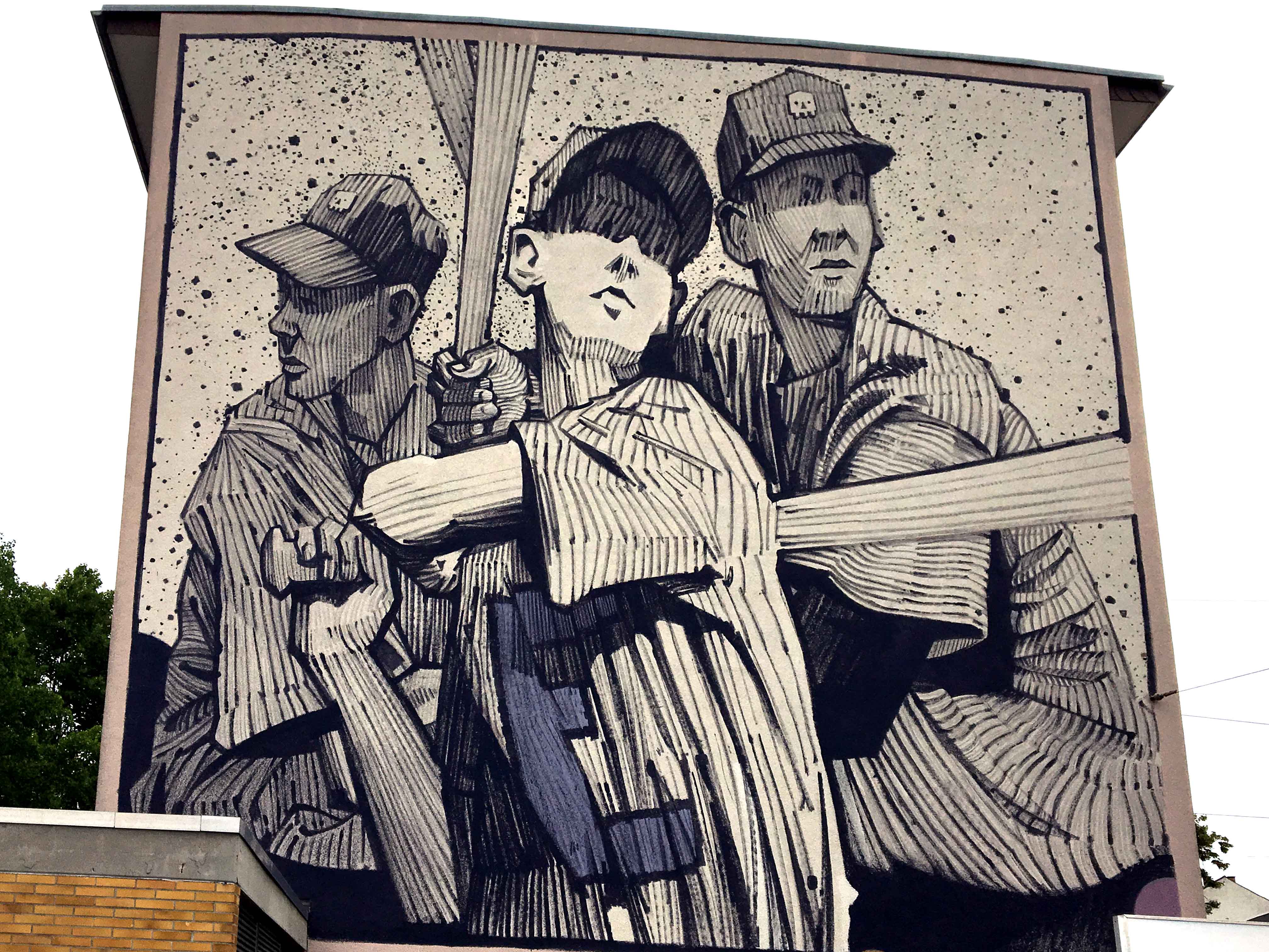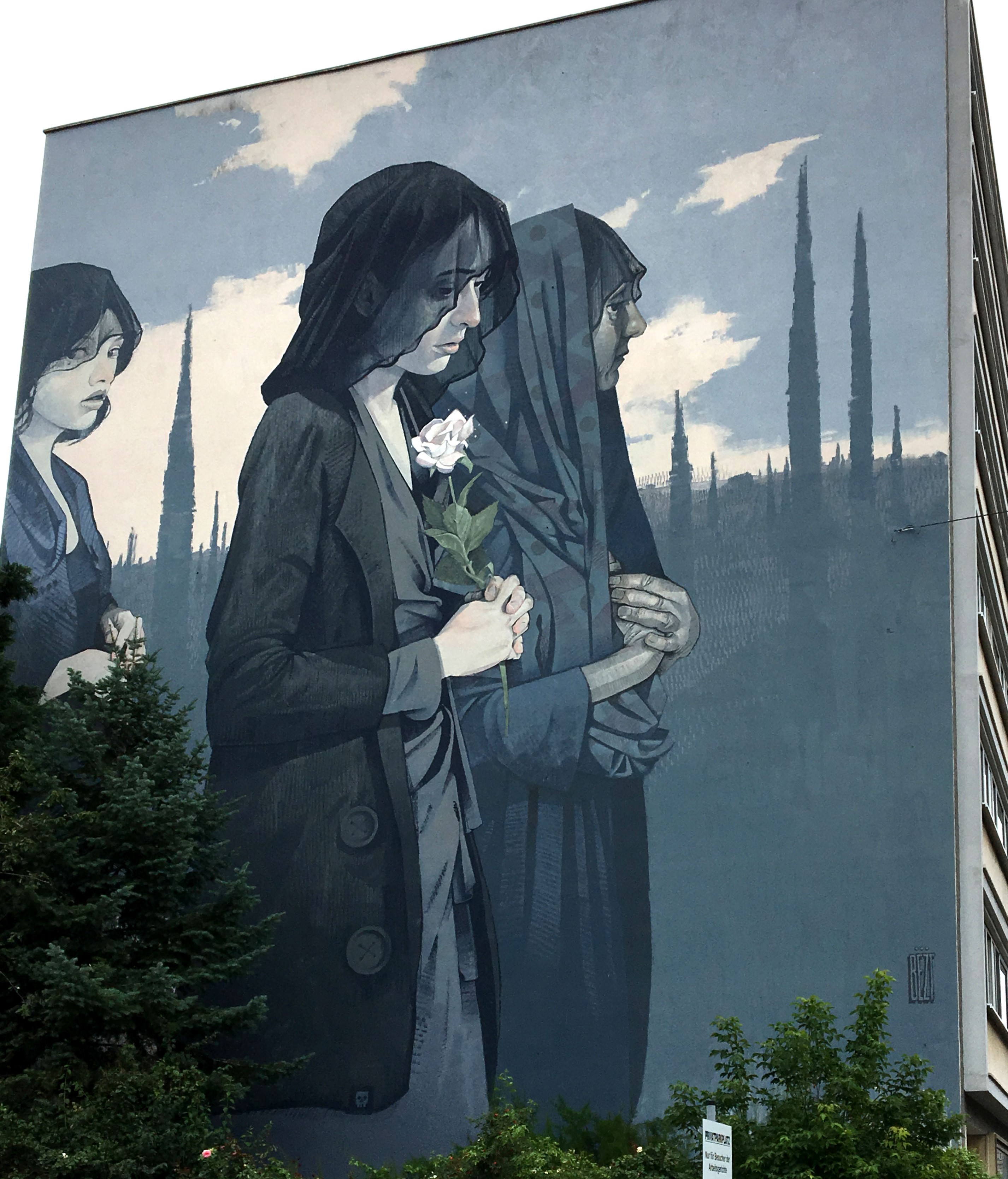 BEZT ist ein Künstler aus Polen, der sich v.a. in Europa einen Namen gemacht hat. Zusammen mit SAINER bildet er die ETAM CRU. Als Team sind sie mittlerweile weltweit anerkannt. BEZT und SAINER sind beide auch als Solokünstler unterwegs, so u.a. in Mannheim, wo zwei wunderbare Murals entstanden. „Europe“, im August 2016 fertig gestellt, besticht durch seine Melancholie und Ästhetik, und soll die Betrachter zum Denken anregen. Stellen die drei Frauen Witwen dar, die Europäische Union betrauern? Quelle: Stadt.Wand.Kunst
