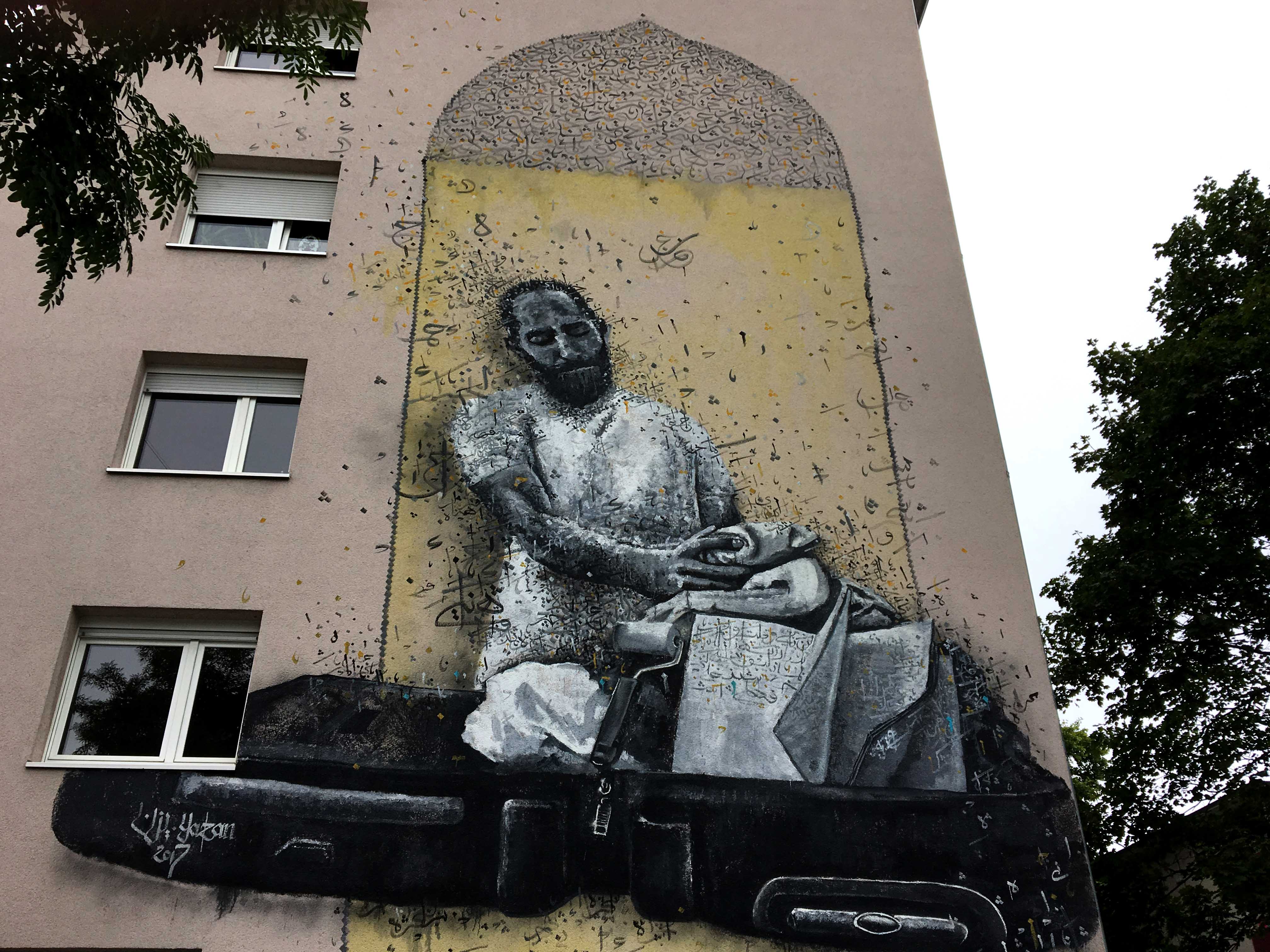 Yazan Halwani ist einer der bekanntesten Urban Artists aus dem Mittleren Osten. Im August 2017 stellte er sein Mural, angeblich bei für Mannheim unübliche heiße Temperaturen, fertig. Das war also nur wenige Tage bevor ich das Foto gemacht habe. „Seinen Stil nennt der Künstler aus Beirut „Calligraffiti“ und kombiniert darin orientalischen geometrischen Muster mit arabischer Kalligrafie und Porträtmalerei. Das Bild, dass der 24 jährige in Mannheim an die Wand bringt, zeigt einen traurigen Herrn, der seine Sachen packt. Das Werk sei allen Menschen gewidmet, die aus unterschiedlichen Gründen unterwegs sein müssten, erläutert Halwani sein Werk“. Quelle: Echo-online