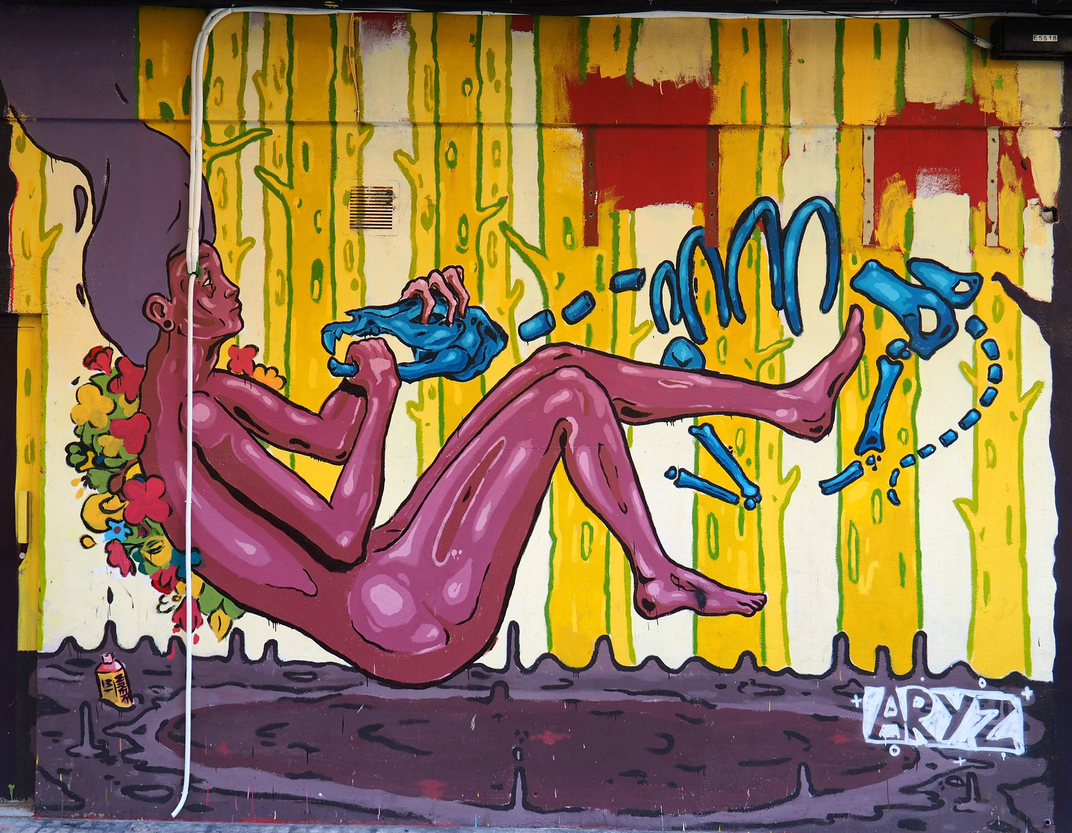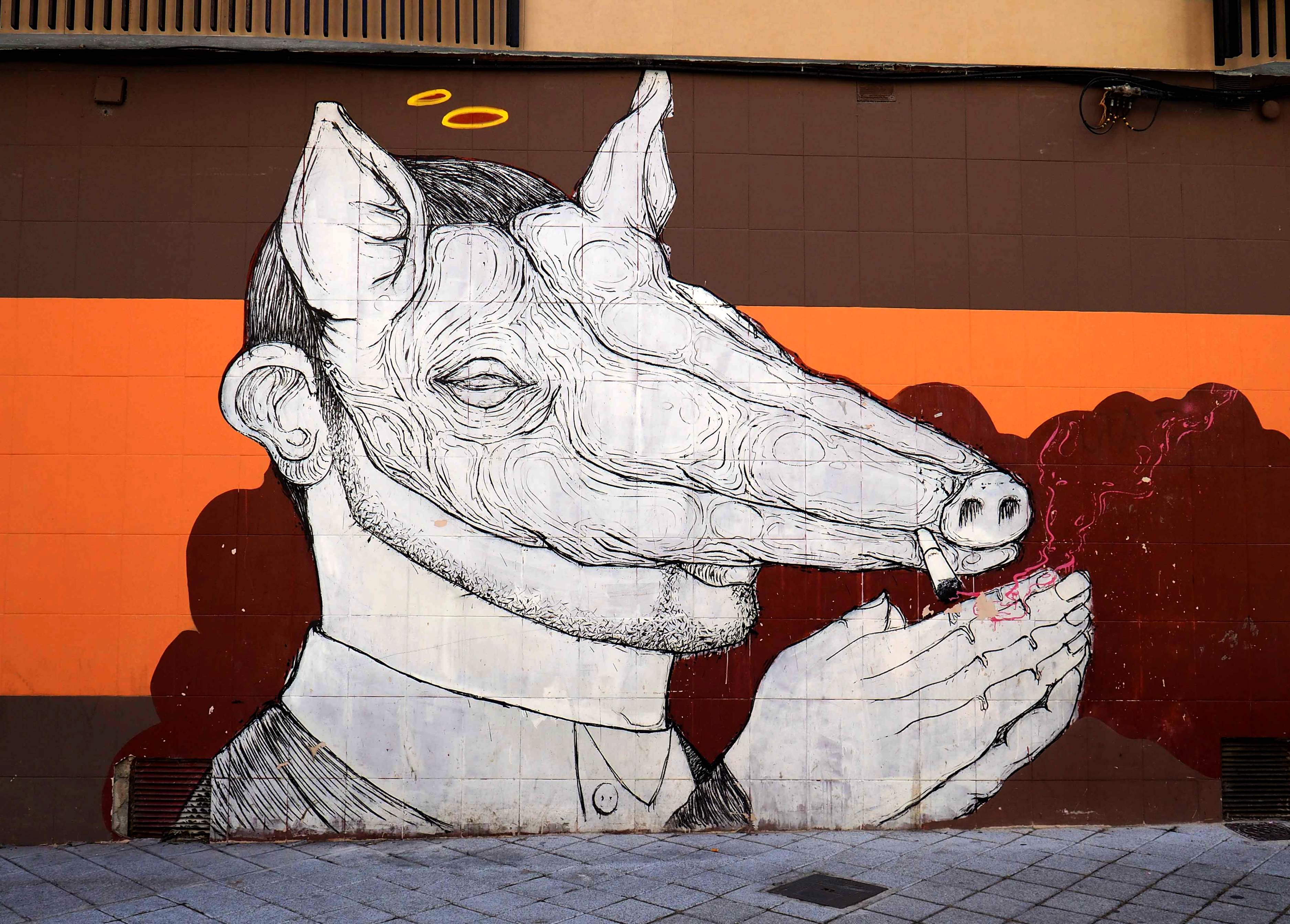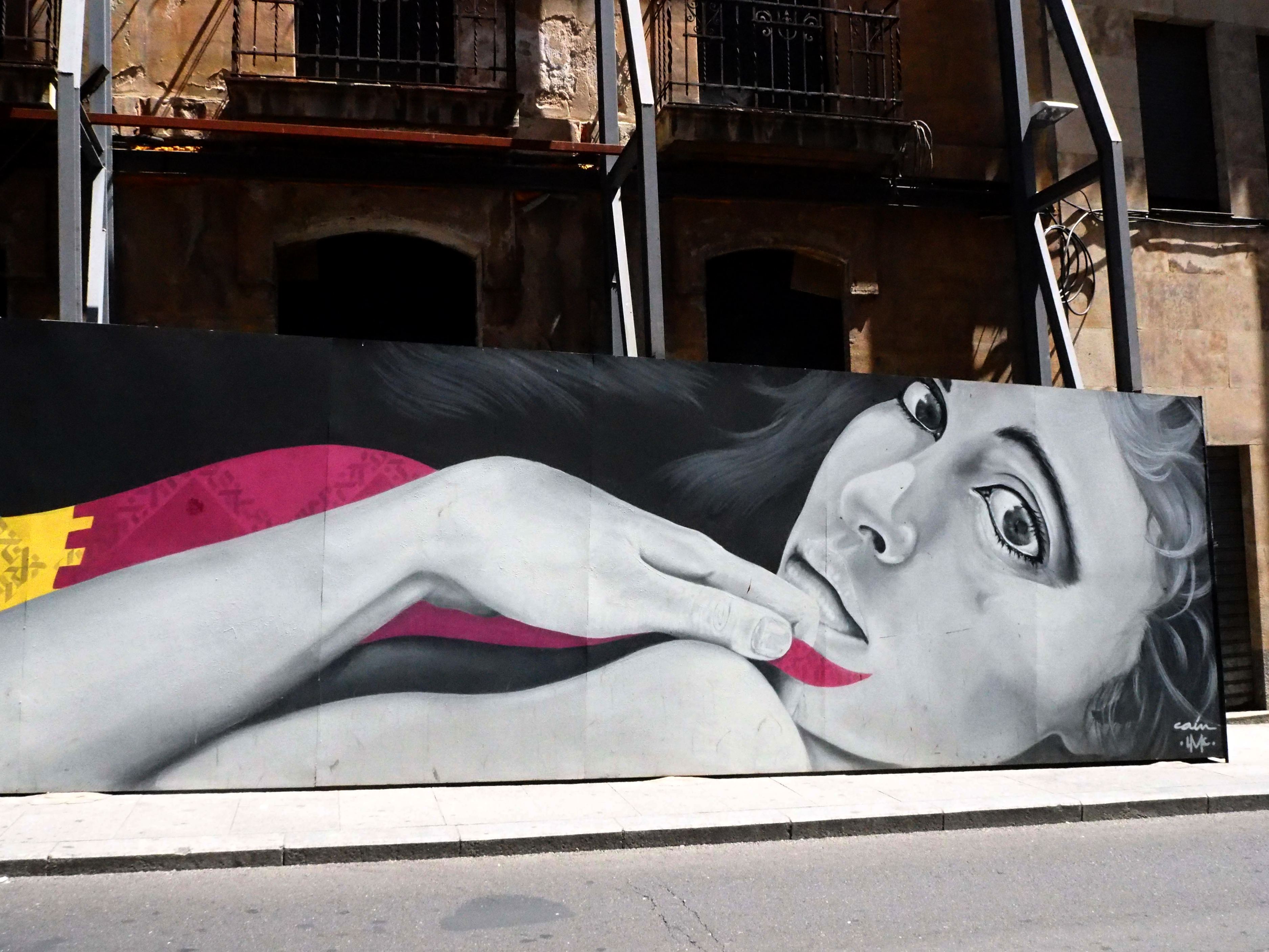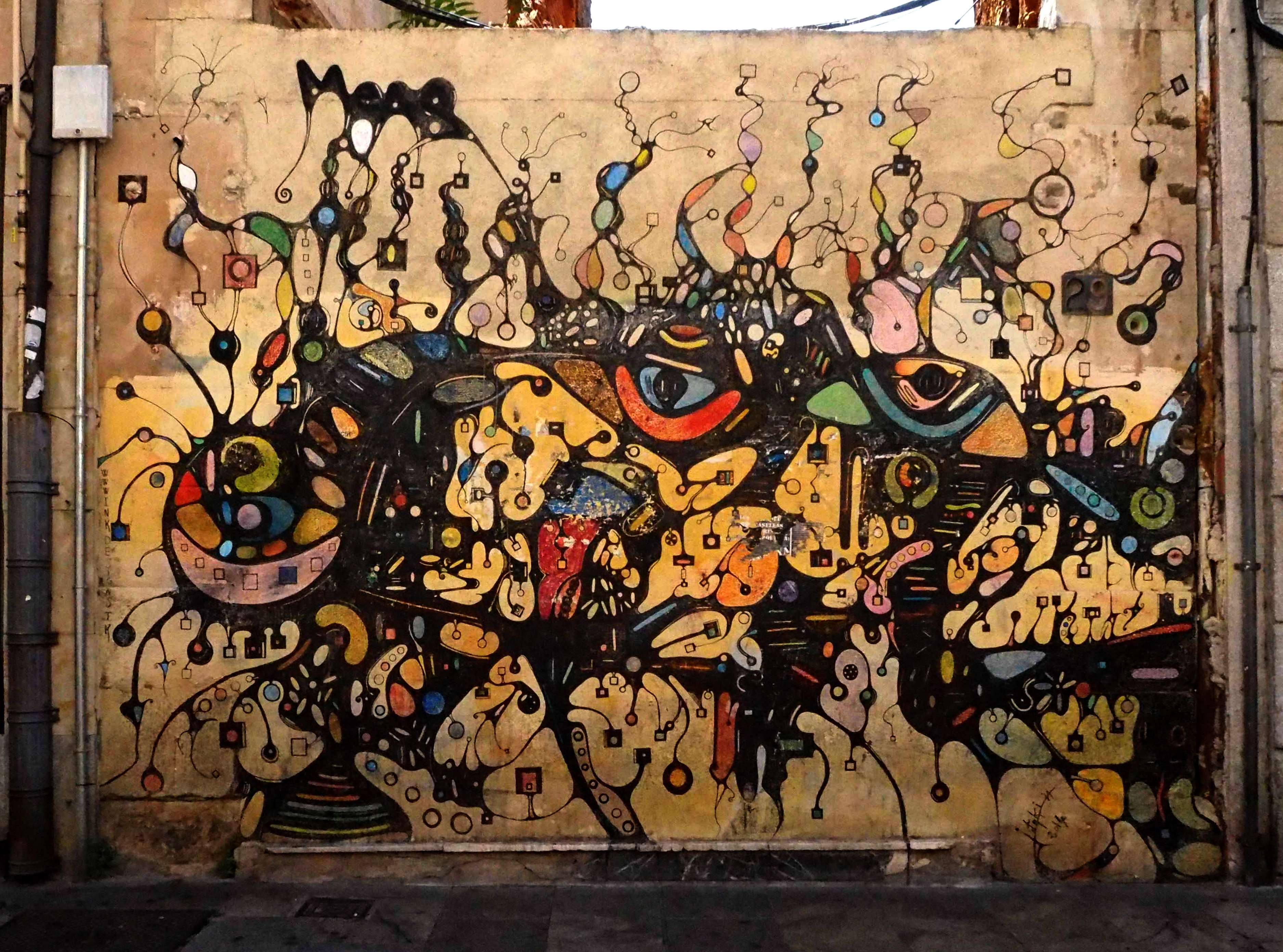 Bilder von Aguiló habe ich erstmalig in Lübeck entdeckt und ihn letztes Jahr in Madrid wiedergefunden. Beide bisher gefundenen Arbeiten waren Paste-ups und diesmal ein ganzes Mural! Das Foto verzerrt ein wenig, da es eine Panoramaaufnahme ist.