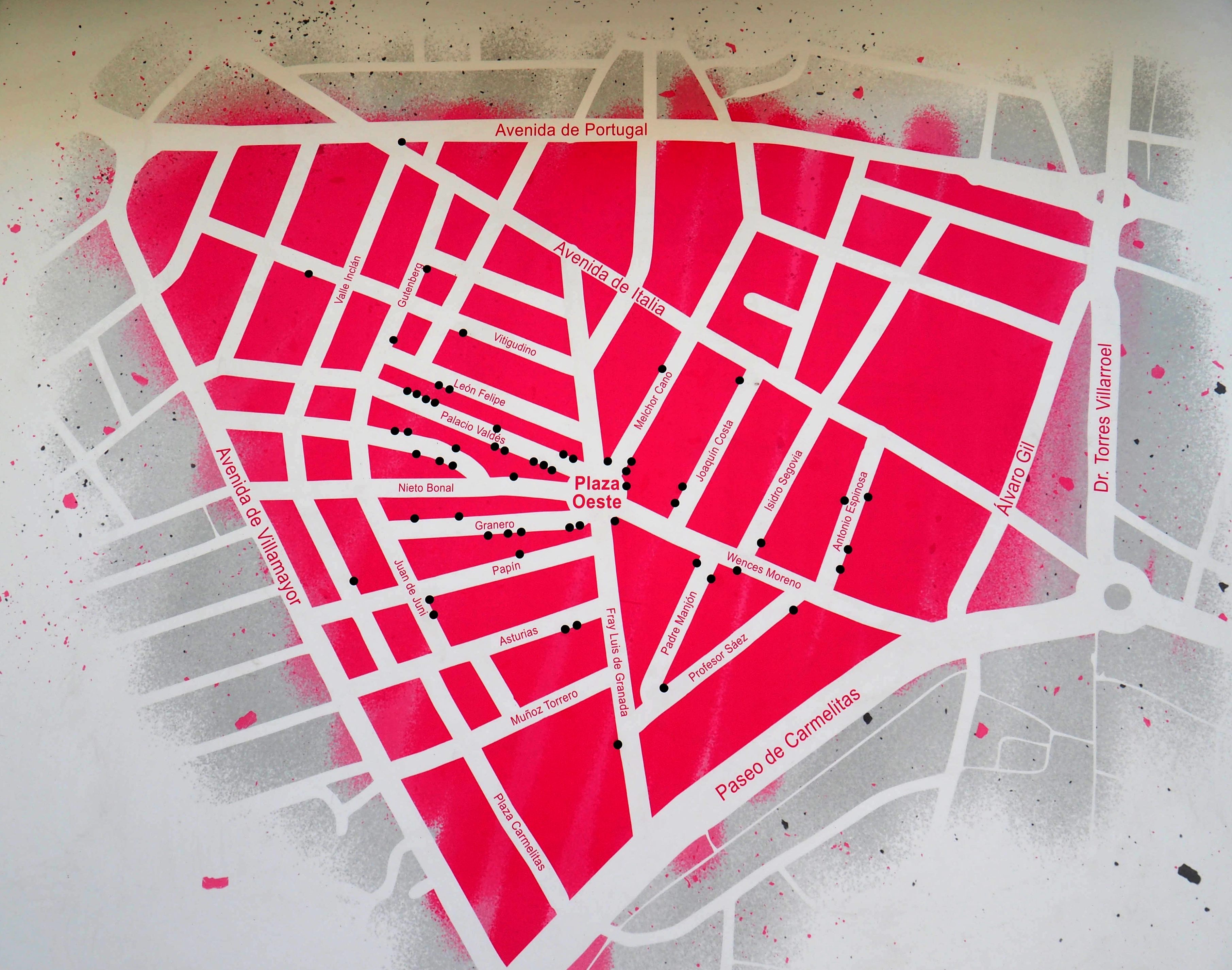 Seit 2013 findet hier die Galería Urbana statt. El Barrio del Oeste liegt im Stadtzentrum und rund um die Plaza del Oeste befinden sich viele kleine Unternehmen, karitative Einrichtungen und eine Nachbarschaft, die gegenüber der Kunst auf der Straße sehr aufgeschlossen ist. Sehr viele Leute haben ihre Garagentore und Hauswände für Street Art zur Verfügung gestellt.