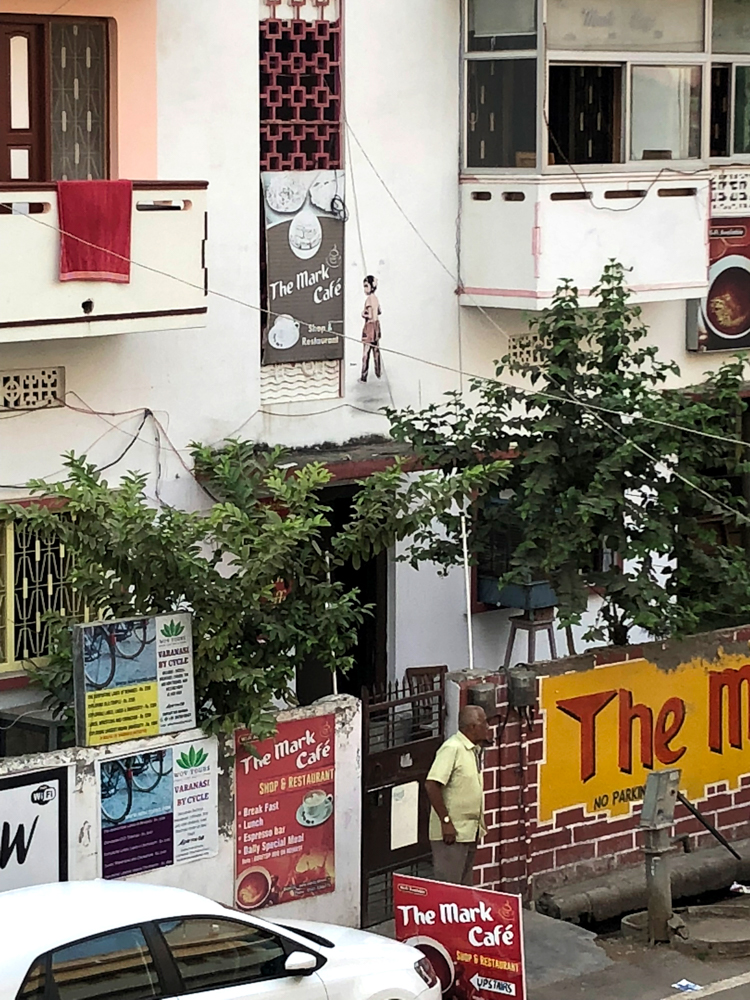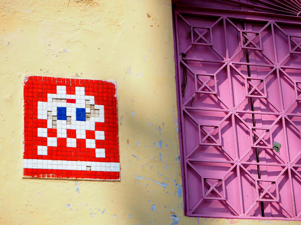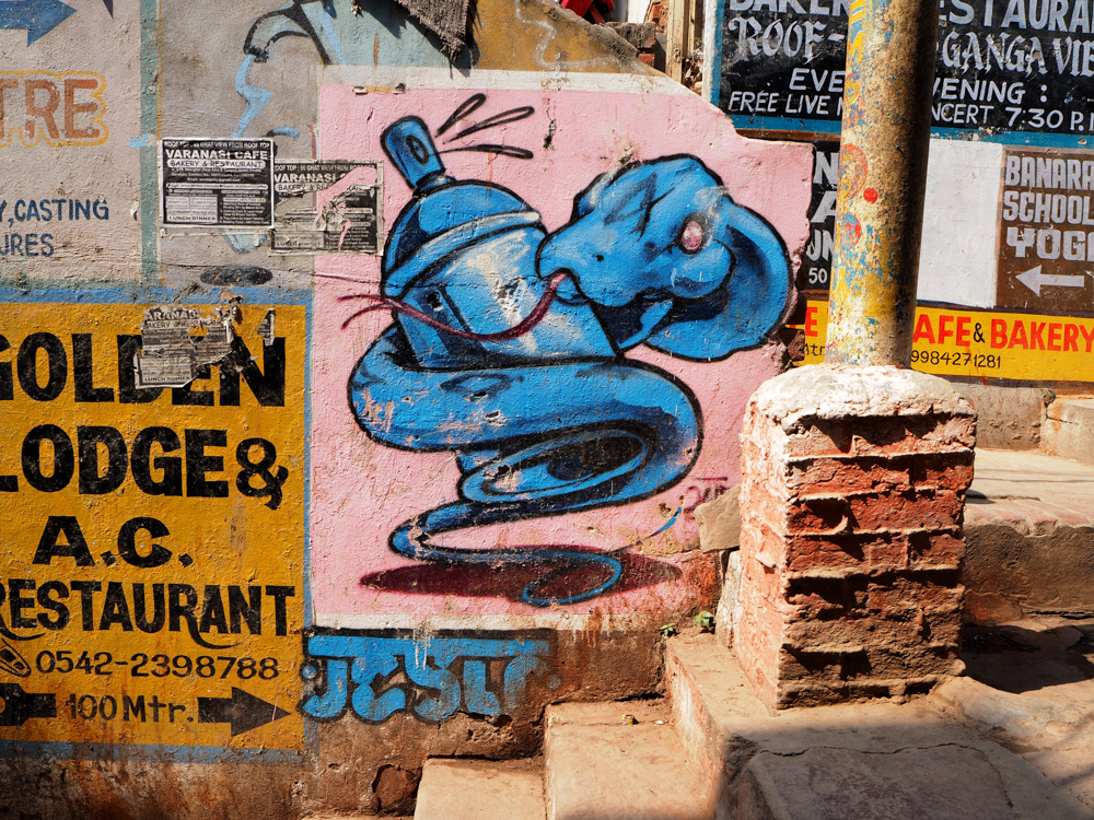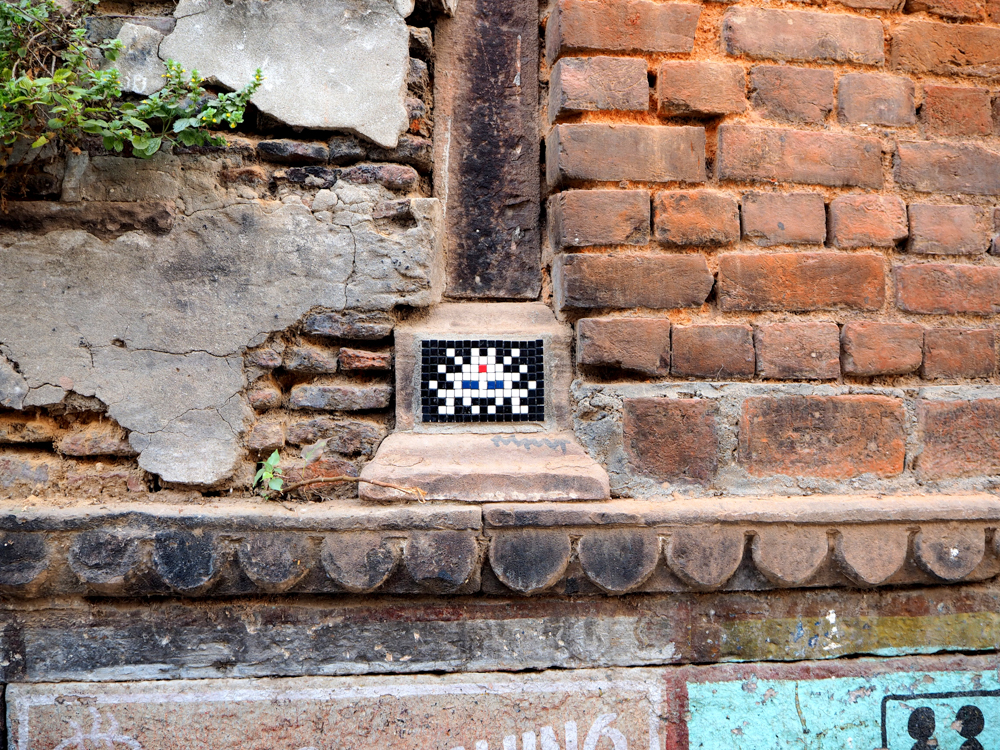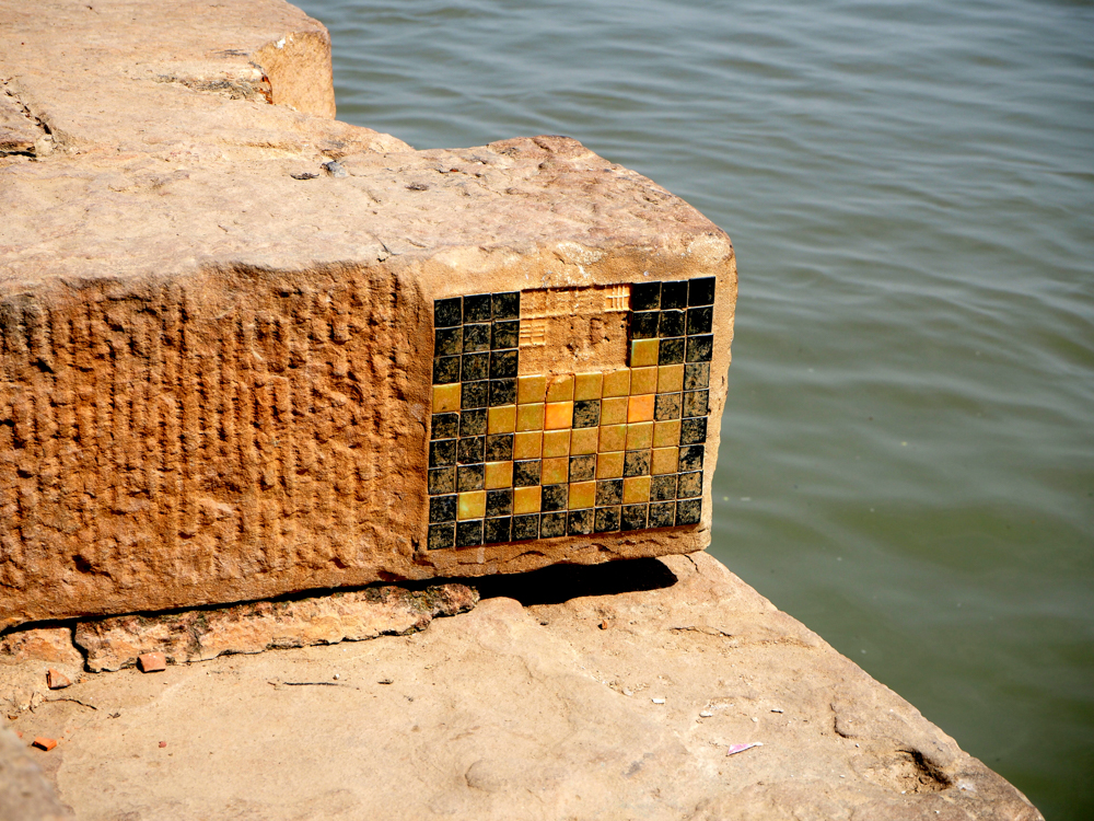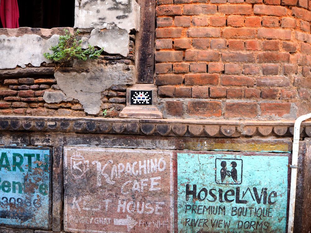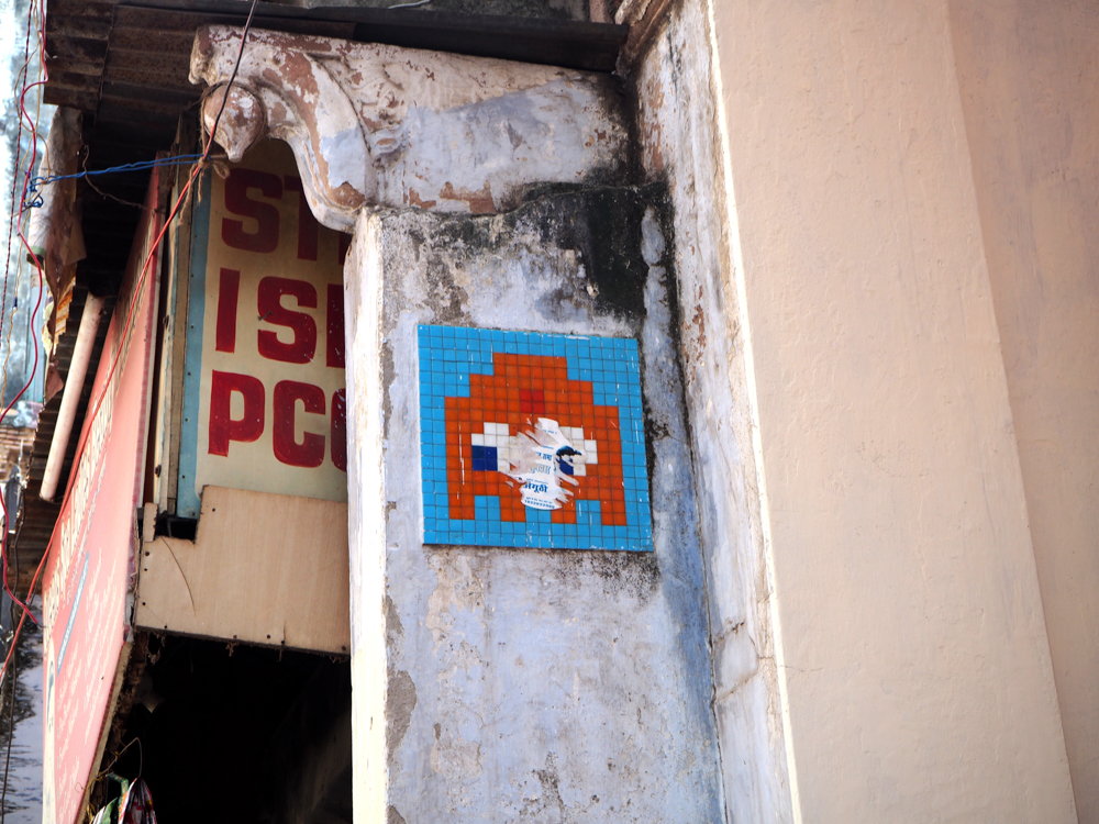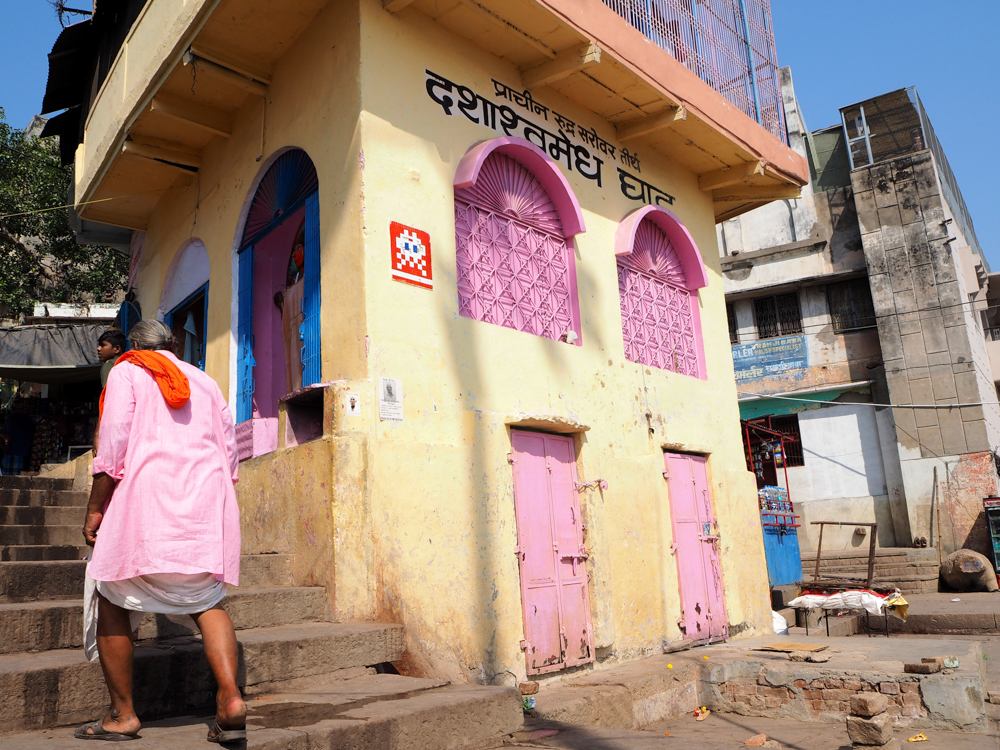 Seiner Internetseite ist zu entnehmen, dass Invader 2008 in Varanasi war. Wenn ich die Seite vorher schon gekannt hätte, wäre ich wahrscheinlich gezielter auf die Suche gegangen. Zum Bild neben dem rosa Fenster gibt es eine lustige Geschichte. Ich machte eine Bootstour auf dem Ganges, mit Gori, dem Boatman, wie er sich bezeichnete. Als ich das Bild von Invader in der Ferne entdeckte, fragte ich Gori was das denn sei, und er meinte es sei ein Schild von der Polizei oder der Feuerwehr. Weit gefehlt!