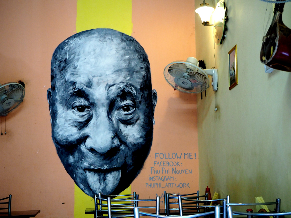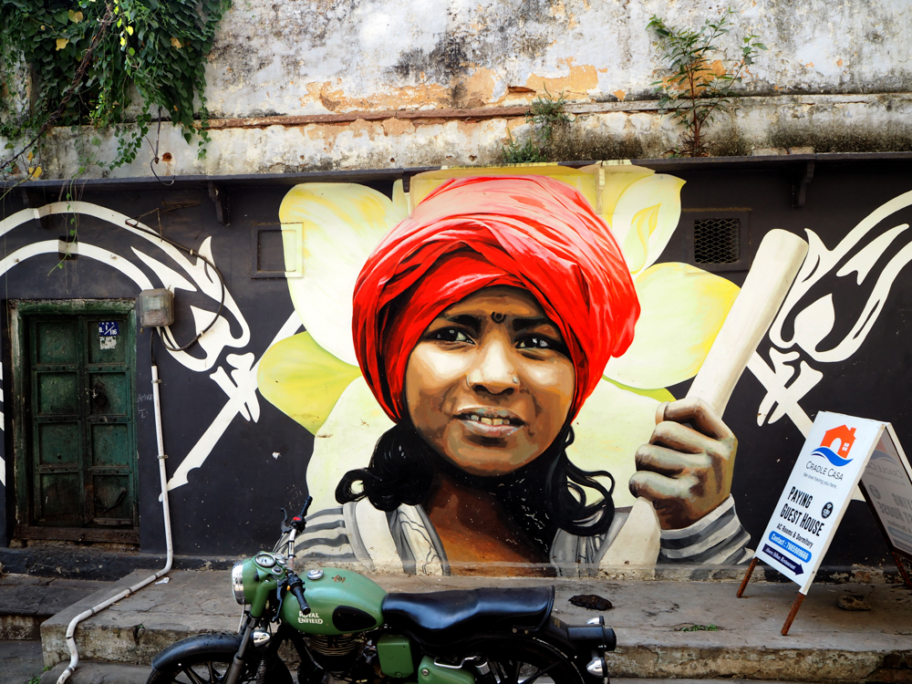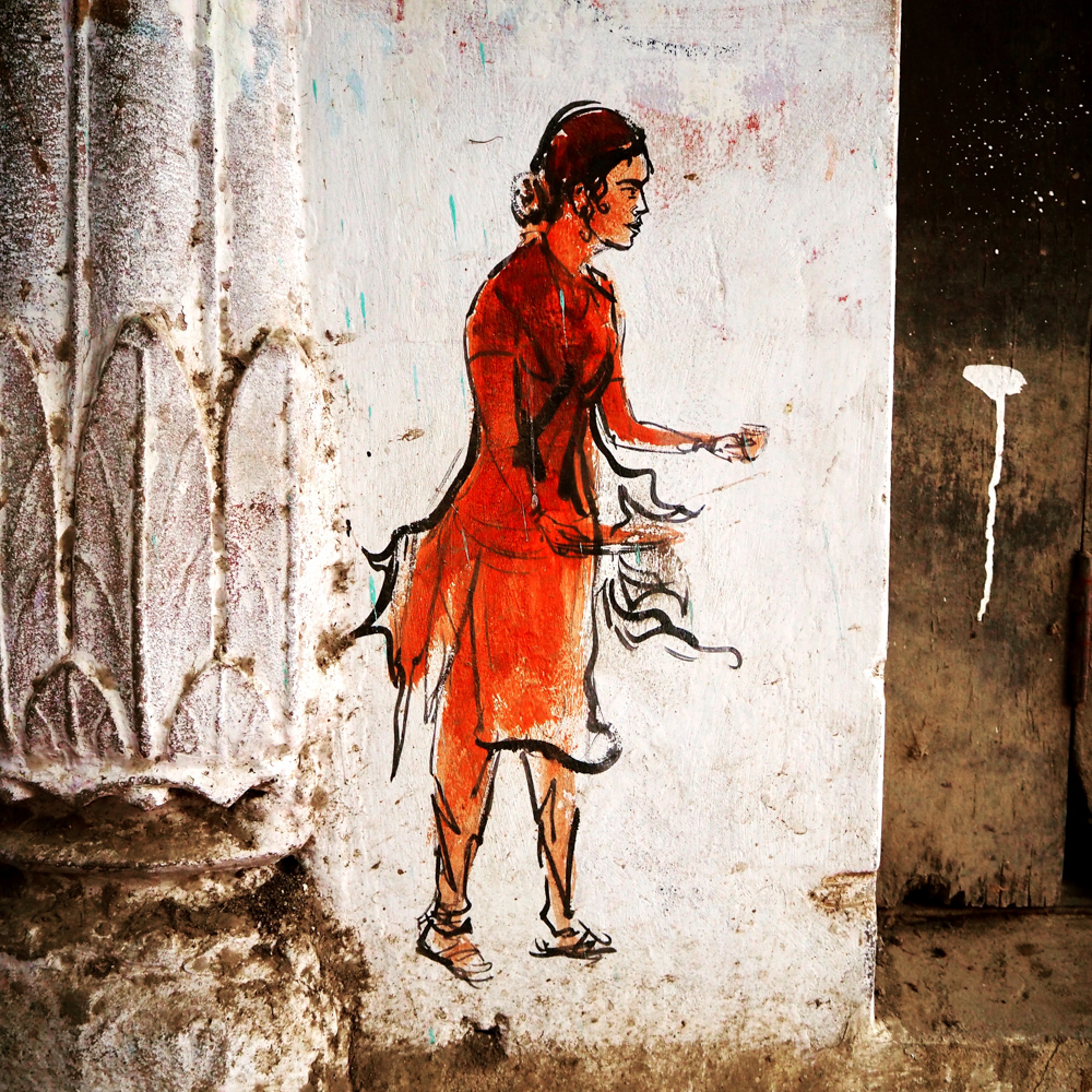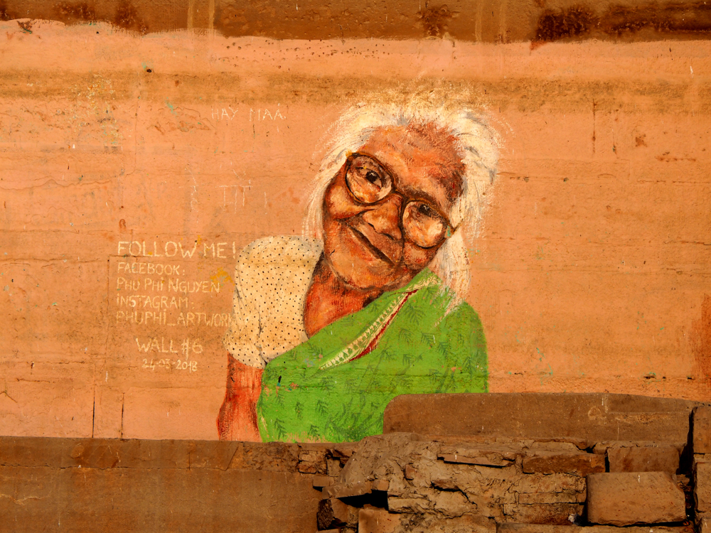 Phu Phi Nguyen ist eine junge Künstlerin aus Paris, Augustina Droze aus NY, Andrea Casciu stammt aus Italien und Vishal Verma hat an der BHU, der Benares Hindu Universität, studiert. Internationale Kunst, an den Mauern von Varanasi.
