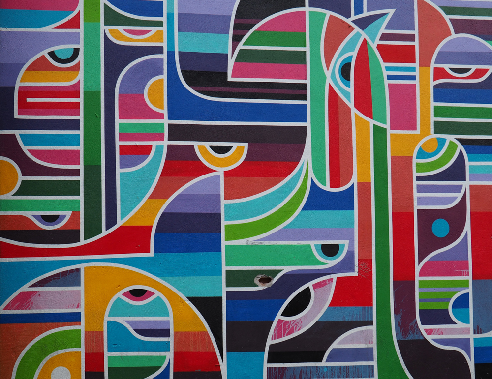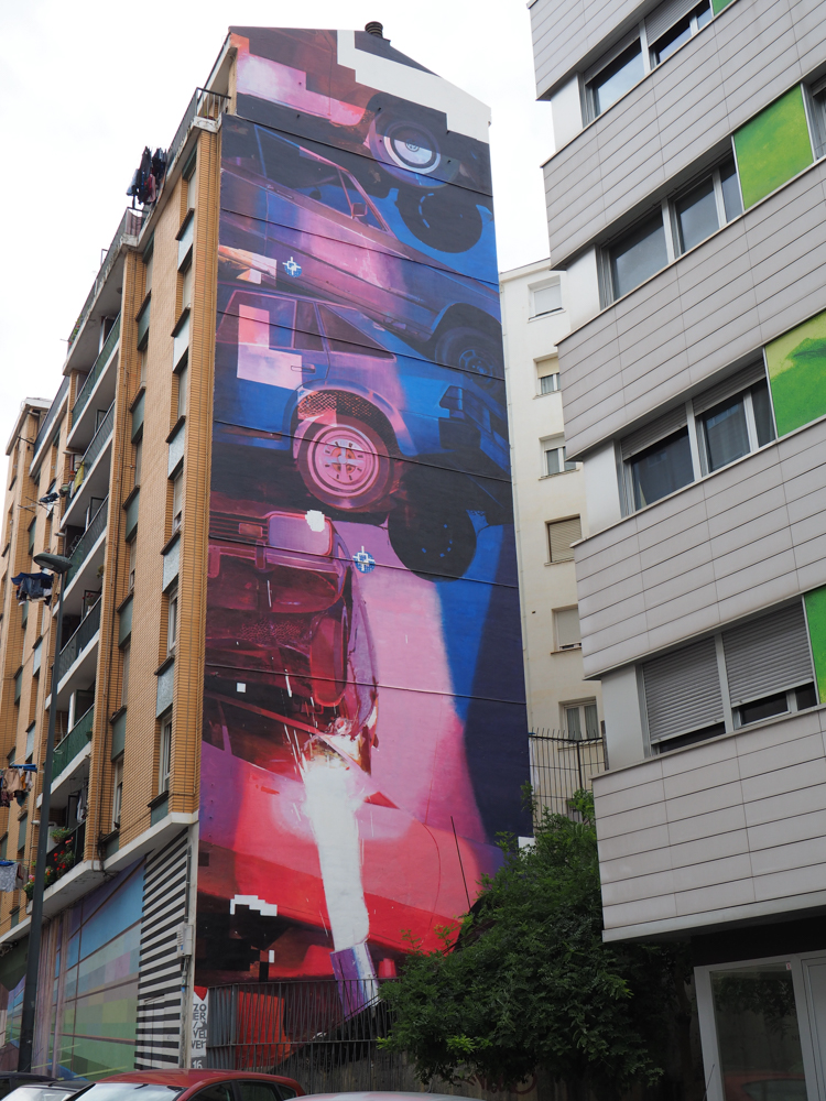 Sergio Hidalgo Paredes, aka Sixe Paredes oder Sixeart, wurde 1975 in Barcelona geboren. Seine Fassade nennt er „Primitiver Futurismus“ und schafft damit ein buntes, abstraktes und psychedelisch wirkendes Bild.