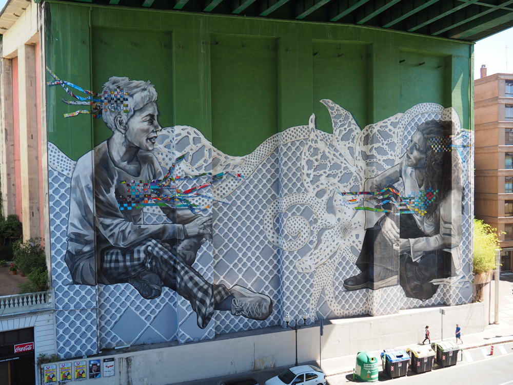 Heute findet sich jede Menge Street Art in der Stadt und es lohnt sich auch deshalb Bilbao zu besuchen! Überall verteilt, und natürlich auch rund um das Guggenheim Museum, gibt es Kunst. Neben klassischen und modernen Skulpturen haben sich viele Urban-Art KünstlerInnen mit ihren Arbeiten etabliert. Direkt am Brückenkopf der Puente de la Salva z.B., schufen die Schwestern Verónica und Christina Werckmeister 2014 ein Werk, „Giltza bat – Una llave“, das darauf hinweisen könnte, dass wir im Gespräch bleiben sollten und die Interaktion auch vor komplexen Hintergründen, wichtig sein könnte. Ein phantastisches Mural, das sich gut vom Treppenhaus auf der gegenüberliegenden Seite betrachten läßt.