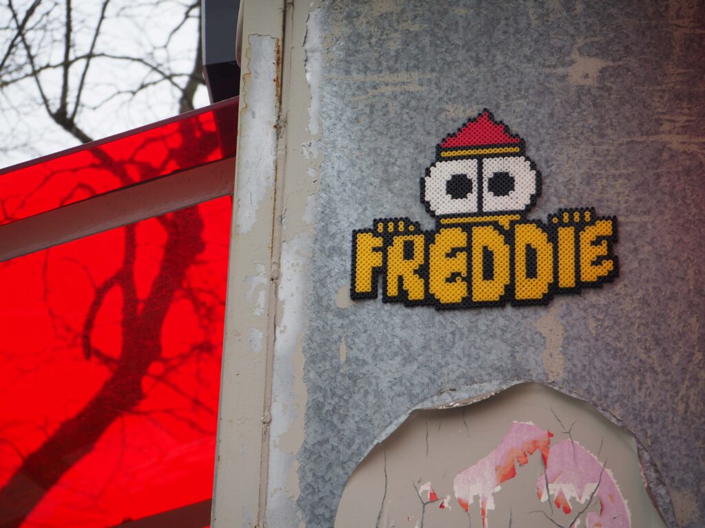 Jutta Wedemann macht nicht nur Kunst, nein sie häkelt kleine Gewesen und pastet Fotos davon, an die Wände der Stadt. Dass nenne ich mal lustig. Auch Fritten Freddie macht was besonderes-er bastelt mit Bügelperlen und bringt sie an die Wand.